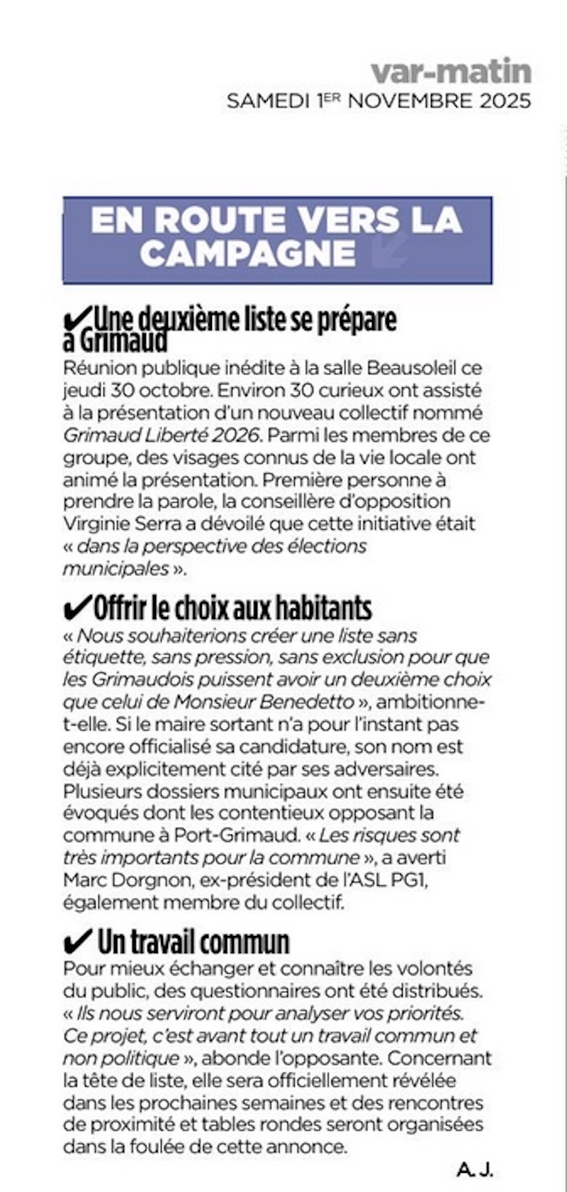 Nous avons fait une première réunion publique le 30 octobre Salle Beausoleil, réunion qui a été relayée par Var Matin.
